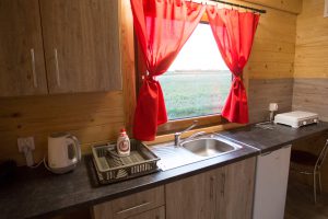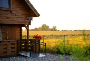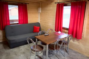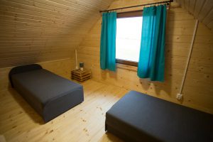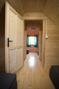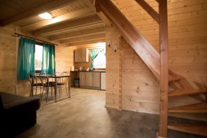 Każdy z domków posiada dwie sypialnie na piętrze oraz salon z aneksem kuchennym oraz łazienką wyposażoną w prysznic przystosowany dla osób niepełnosprawnych. Dodatkowym udogodnieniem jest telewizor oraz grill. Przed domkiem znajduje się zadaszony taras, na którym można miło spędzać letnie wieczory.